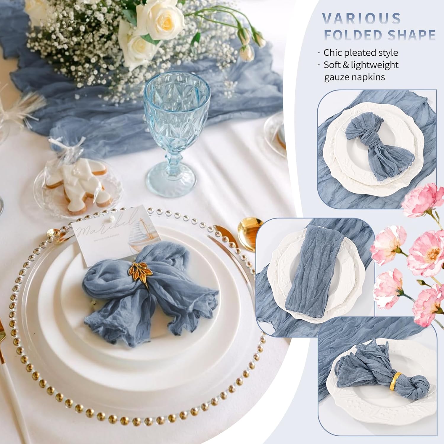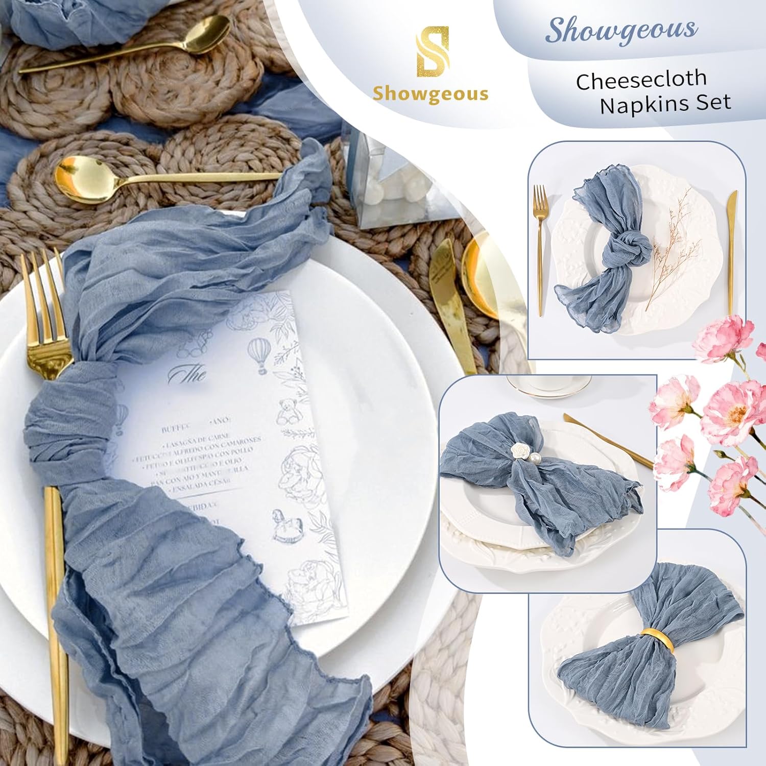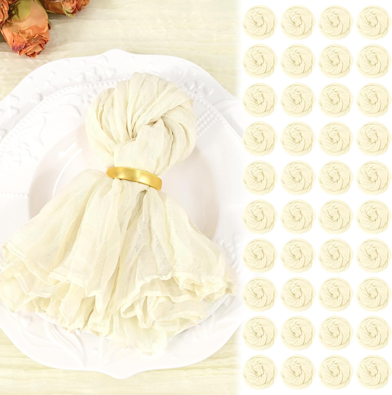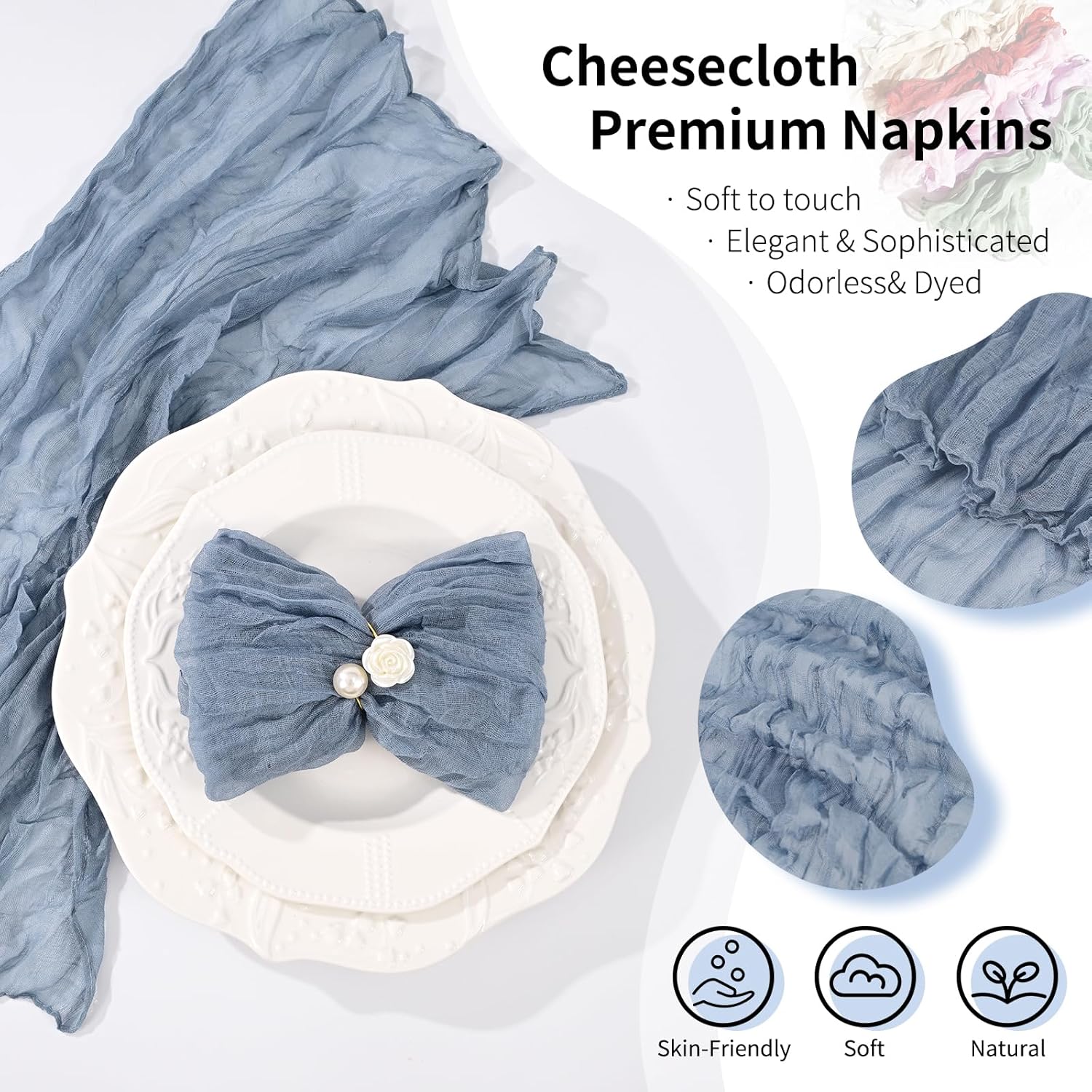 Spring Cloth Napkins Washable Boho Gauze Cheesecloth Napkins BulkSize: 20" L x 20"WQuantity: 10 pcs/50 pcs/100 pcsMaterial: High Quality Gauze FabricSoft and Durable MaterialCheese cloth napkins are made of good quality premium sheer fabric with wrinkled design, soft touch, light weight, not easy to fade, not shrink and reusable.Rustic Style - Soft and breathable cheesecloth napkins made of gauze are perfect for adding a touch of farmhouse charm to your home decor.Decorative NapkinsWe have multiple colors to choose from.Soft fabric make them can be folded into many different shapes, such as rose shape, pocket shape, boat shape, heart shape etc, adding a playful touch to your dining table.They can be used as party napkins or as bow ties for gift wrapping.Perfect Addition To Any OccasionThe bulk cloth napkins are gentle on the skin and is perfect for wedding/ birthday party/ banquet/bridal shower/ baby shower/ candy buffets/ Christmas/ Thanksgiving/ New Year/ Valentine's day.Cheesecloth NapkinsDecorate Your Beautiful Dining Table!Suitable for All Occasions and Perfect as Gifts!This lightweight and soft cheesecloth napkin adds romance and warmth to your dining table, enhancing the party atmosphere.Invest in our napkins and see the difference they make in your life's precious occasions.Q&AAre these napkins hemmed?Yes, considering the possibility that the soft yarn will draw, we made a sealed edge design, which not only looks neater, but will also be more durable. Make it keep a good condition even after repeated washing.How do I wash and care for this napkin?Choose mild detergent, use cold or lukewarm water to wash, hand wash is recommended, please choose gentle wash mode when machine washing. Dry naturally, no need for ironing.Fold it into a ball after washing is good for keeping it wrinkled.Will the color fade after washing?No,Dyed with natural, non-toxic pigments, the color stays vibrant-no fading even after multiple washes. Just air-dry gently to retain the fluffy ruffled texture.How to create a stunning spring table with the napkins?Showgeous sell a variety of spring table decorations,suitable for weddings, birthdays, parties and other spring events,with table runner made of the same material as the napkins, adding a touch of color to your fallife.I like the material of these napkins. Do you have any table decorations made of the same material?Yes, our store also offers cheese cloth table runners in the same color scheme. You can choose a matching table runner to complete a table decoration with a consistent style.
