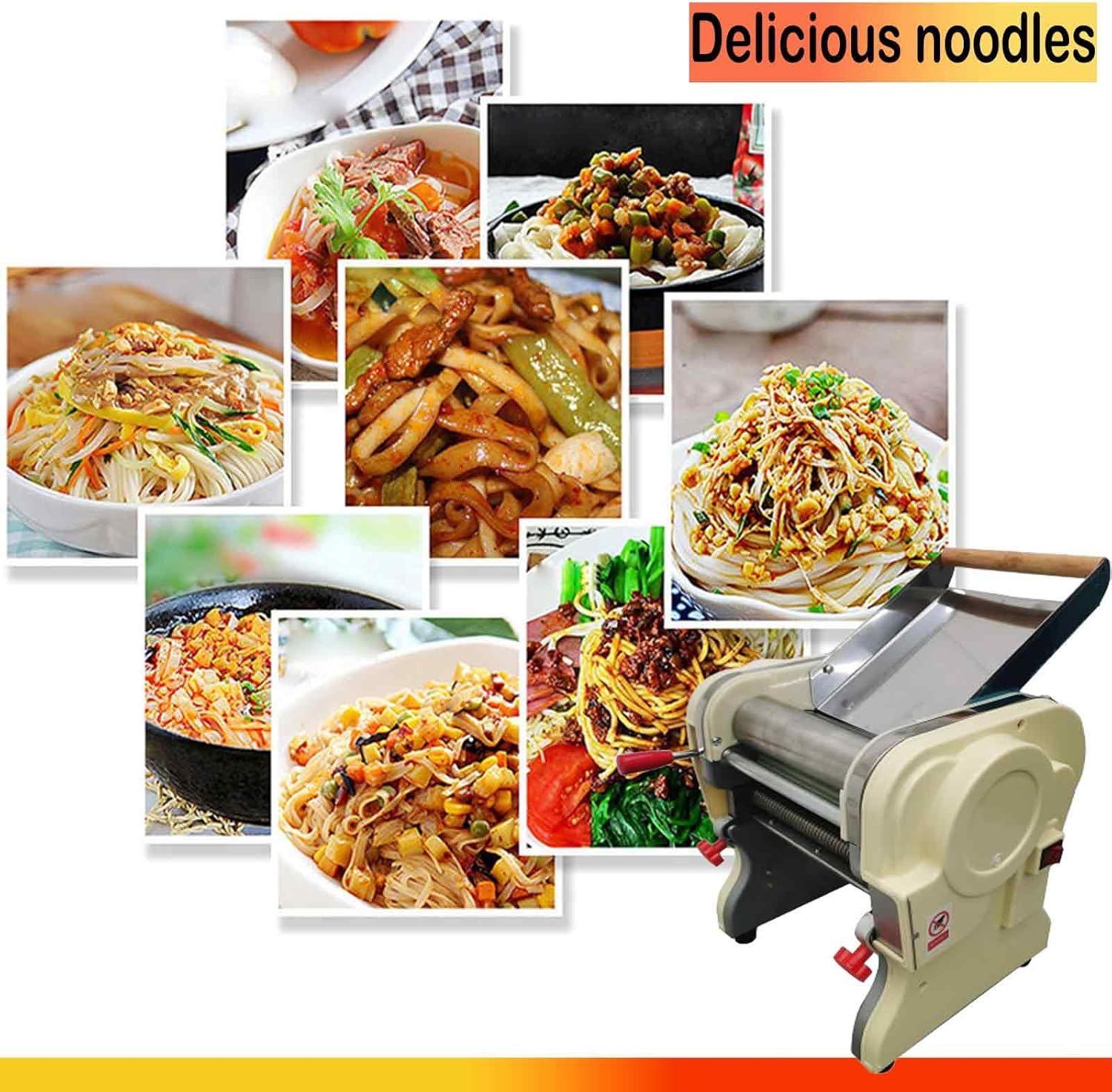 Parameters:Voltage: 110VPower: 550WMaterial: Stainless SteelDough Knife Length: 20cm(7.8inch)Noodle width: 3mm(0.11inch)The thickness of the dough: 0.5-5mm (0.02-0.2inch)Package Size: 18.11" x 15.35" x 19.09"Package Weight: 45.75 lbPlease note that the noodle press is not silent during operation.
