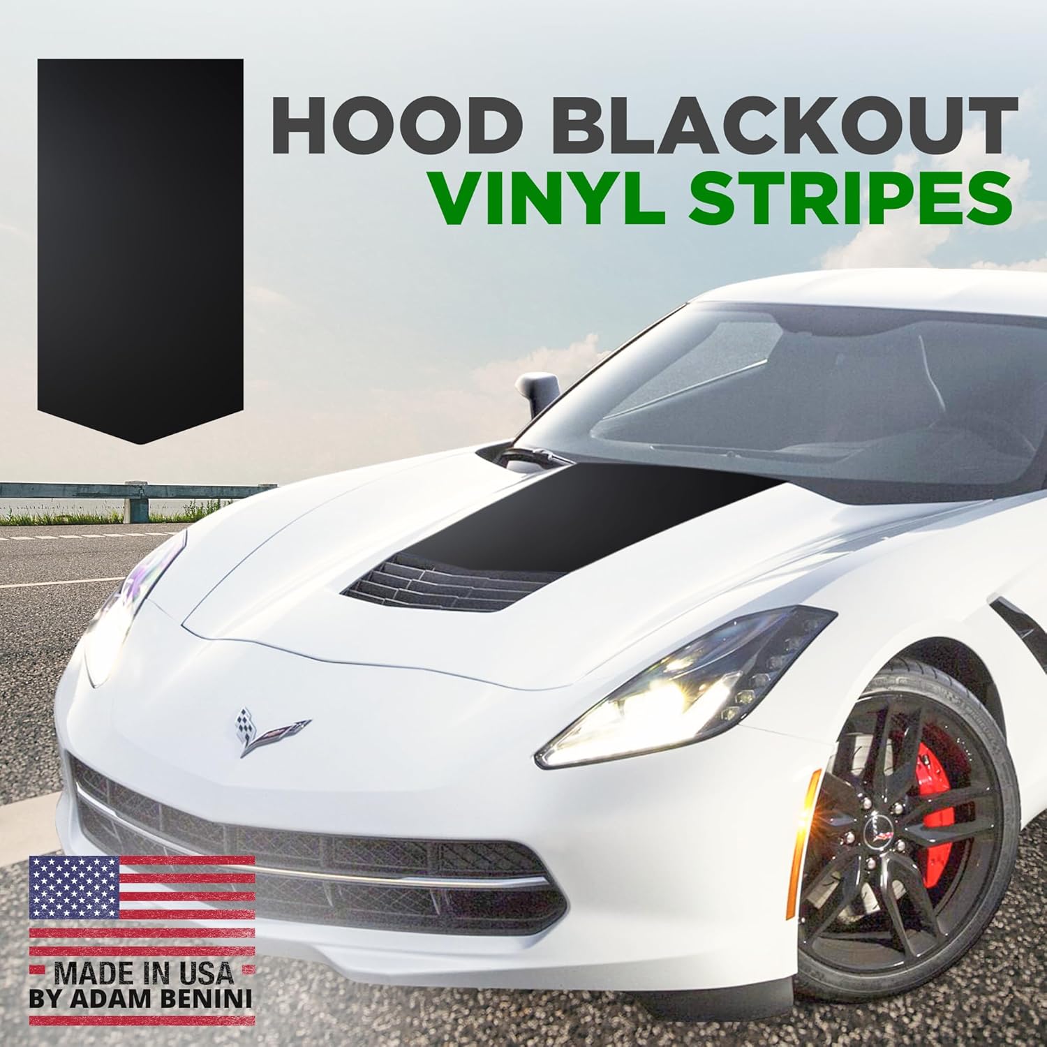 Corvette C7 Custom Car Decals are a popular customization option for Corvette enthusiasts who want to add a black out, sporty or aggressive look to their car with custom car stickers. Our custom stickers for cars are made of high performance 7 year vinyl and are applied to the hood of the car in a specific OEM style blackout design. For 2014 Corvette C7, 2015 Corvette C7, 2016 Corvette C7, 2017 Corvette C7, 2018 Corvette C7, 2019 Corvette C7 C7 Corvette Accessories remain a popular option for Corvette owners who want to customize their 2014-2019 Corvette 's appearance. Custom decals for cars offer your 14-19 C7 Corvette an aesthetic enhancement. Vinyl Custom Car Sticker stripes can dramatically enhance the appearance of your Corvette, giving it a more sporty or aggressive look helping your Corvette stand out from the crowd. For 14 Corvette C7, 15 Corvette C7, 16 Corvette C7, 17 Corvette C7, 18 Corvette C7, 19 Corvette C7 Blackout decals for hood can offer protection on your 2014 - 2019 C7 Corvette stripes (Vinyl stripes) can also serve a practical purpose by protecting the racing hood of your C7 Stingray from scratches, rock chips, and other types of damage. This is especially important if you plan on doing any high-speed driving or if you live in an area with harsh weather conditions. Car exterior decals can offer resale Value. Adding a Corvette Stingray Decal to your Corvette C7 can also increase its resale value, as it makes the Base C7 Corvette Stingray more attractive to potential buyers who are looking for a personalized and unique vehicle with C 7 Corvette Accessories.
