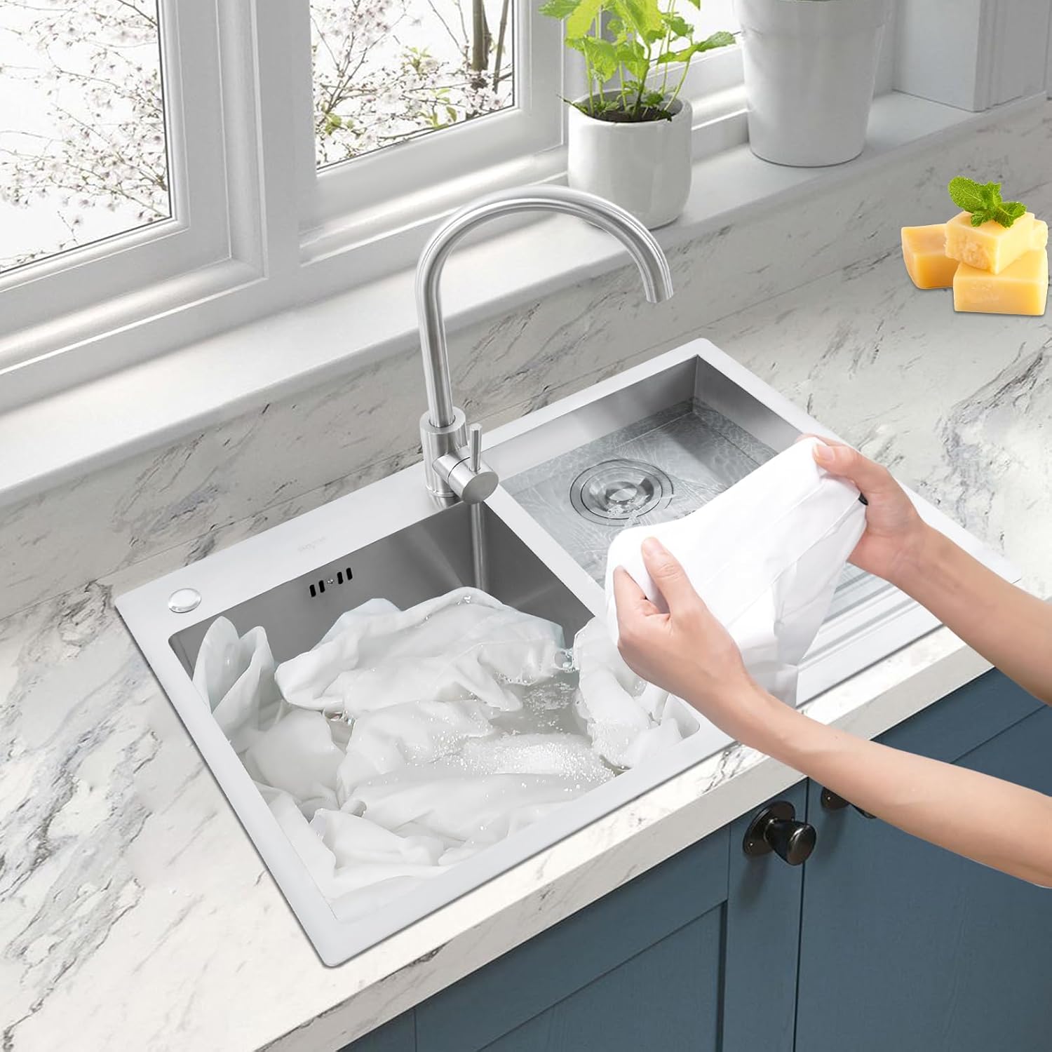 DescriptionAn exceptional laundry sink can greatly enhance the washing experience, making it an elegant ritual in life. It is not only a practical assistant in household labor but also an indispensable part of home aesthetics. With its durability and functionality, the well-selected and cleverly designed laundry sink turns the tedious cleaning work into a leisurely time.ApplicationStainless steel double bowl laundry sink applies to laundry rooms, bathrooms, garages, basements, balconies, courtyards, gardens, etc.Specification● Color: Silver● Style: Modern● Shape: Rectangular● Assembly Required: Yes● Material: 304 Stainless Steel● Process: Wire Drawing● Mounting Type: Drop-in, Top-mount, or Under-mount● Left Basin Size: 33.8x37.6x22cm/13.31x14.8x8.66in● Right Washboard Sink Size: 43.2x29cm/17.01x11.42in● Each Drain Diameter: 11cm/4.33in● Interface Size of Water Inlet Pipe: 1/2"● Product Size: 70x48x22cm/ 27.56x18.9x8.66in● Package Size: 76x53.5x27cm/ 29.92x21.06x10.63in● Drop-In Installation Suggested Countertop Opening Size: 67x45cm/26.4x17.7in● Undermount Installation Suggested Countertop Opening Size: 66x44cm/25.6x17.3in● Gross Weight: 11kg/24.25lbs● Net Weight: 10kg/22lbsPackage Included● 1 x Laundry Sink● 1 x Faucet●1 x English and Chinese Manual● All Accessories for InstallationNotePlease measure the opening size of the base cabinet in advance so that the item can be installed smoothly.