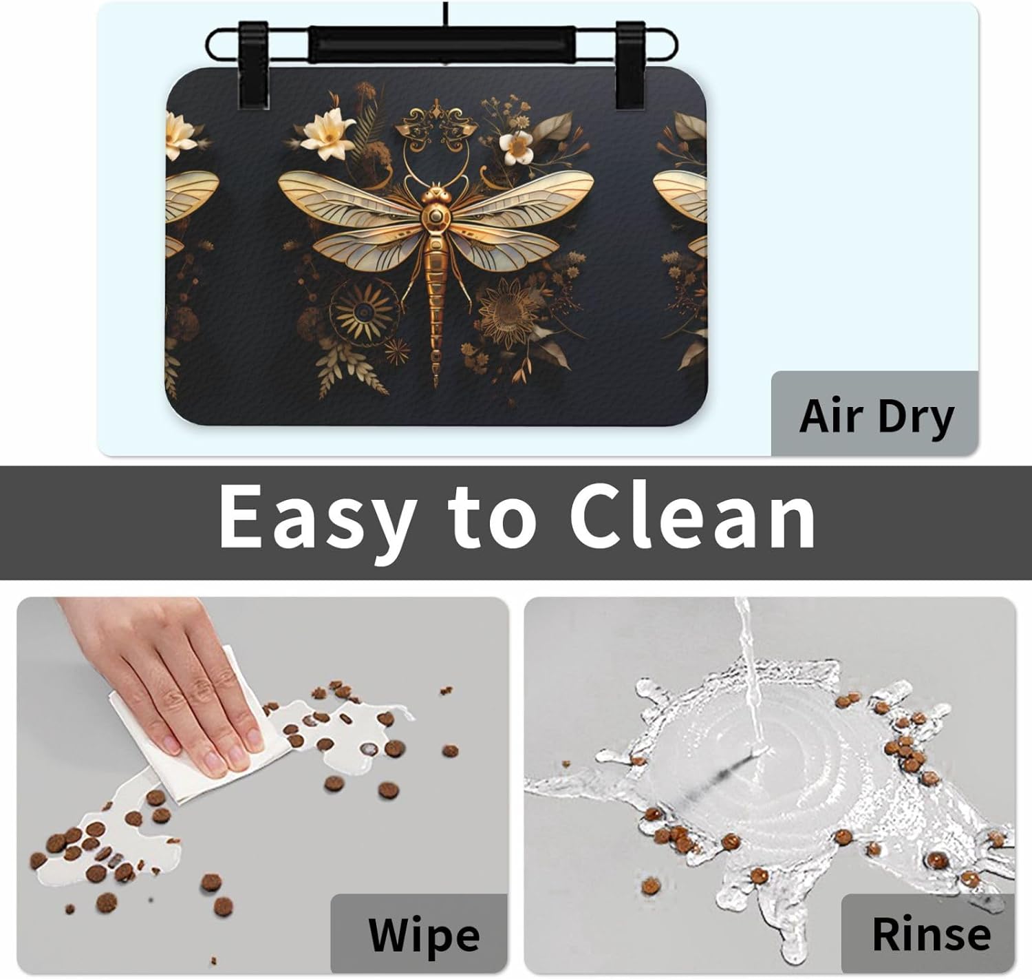 Product Description:Transform your pet's feeding experience with our advanced Gold Exquisite Dragonfly print Pet absorbent leather tablecloth. Engineered with a PU surface and waterproof rubber backing, this innovative design offers unparalleled performance. Super strong water absorption and quick drying ability, avoid getting your pet's paws wet and keep your pet's eating environment clean. Our pet Non-Slip mats come in 2 sizes and are perfect as a dog food mat or a cat food mat.30x45cm Gold Exquisite Dragonfly print pet feeding placemat :Small mat17.7" x 11.8". Large mat 23.6" x 15.7".The non-staining material ensures that no traces of food or water remain on the mat, keeping it looking fresh every time. Additionally, its foldable structure makes it easy to store or carry, while the non-slip rubber base keeps the mat steady during active feeding sessions. Elevate your pet's comfort and preserve your home's cleanliness with this reliable accessory.