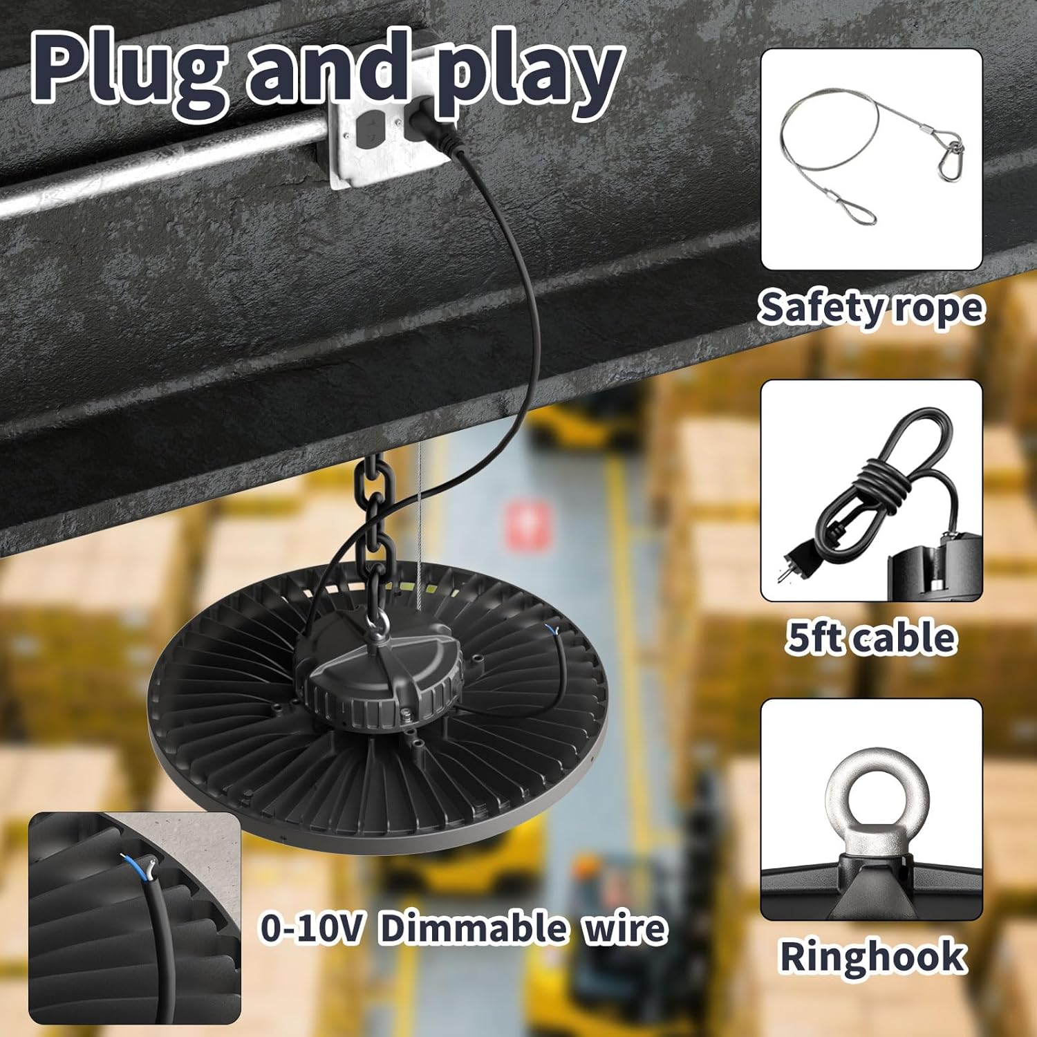 | Included Components | 0-10v dimmable wire*6, 5ft Cable with US Plug*6, Safety Rope*6, Steel Hook*6, LED High Bay Light*6 |