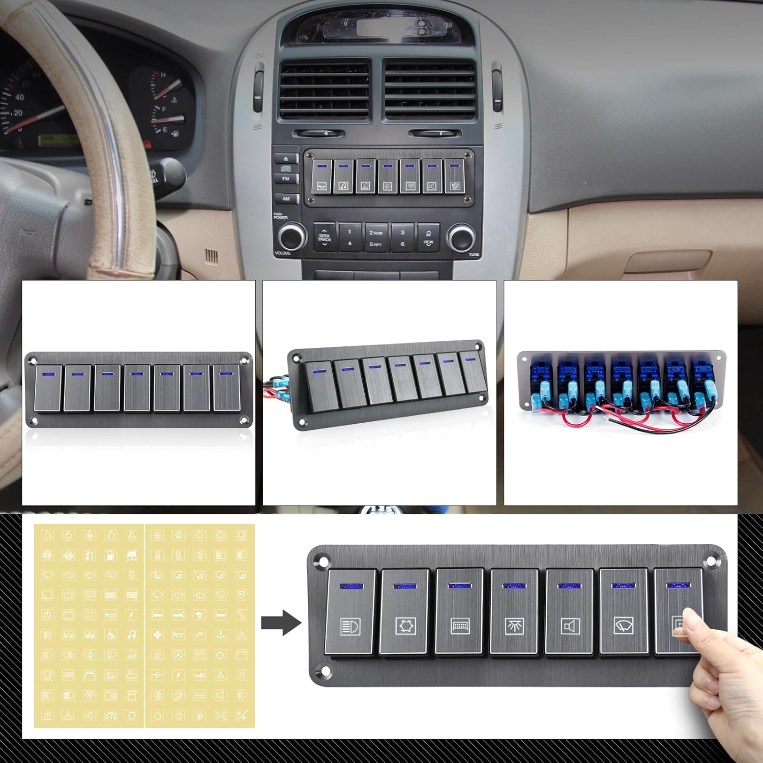 Professional 4 Gang Aluminum Rocker Switch Panel designed for 12-24V marine, automotive, RV, truck and trailer applications. Engineered with waterproof sealed toggle switches featuring blue backlit illumination for clear visibility in low-light conditions. Pre-wired circuitry ensures simplified installation. Durable CNC-machined aluminum housing resists corrosion and impact. ON/Off rocker switches provide reliable power control for navigation lights, pumps, winches, and accessories. Universal voltage compatibility (12V/24V DC). Ideal replacement switch panel for boats, vehicles, and mobile equipment requiring robust electrical management.