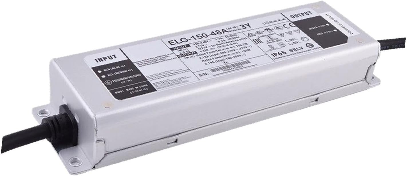 The POWALK ELG-150-48A-3Y is a high-performance AC-DC LED driver designed for professional lighting applications, delivering reliable power with advanced features for energy efficiency and durability. This driver excels in converting AC input to DC output, supporting a wide input voltage range of 100-305VAC or 142-431VDC, and providing a stable 48V output with a rated current of 3.13A. Its constant current and constant voltage (CC+CV) mode allows for adjustable output between 43.2-52.8V and 1.56-3.13A, ensuring flexibility for custom LED setups. With a maximum power rating of 150W and up to 90% efficiency, it minimizes energy loss and features standby power below 0.5W for sustainable operation. Physical specifications include compact dimensions of 8.63 inches in length, 2.48 inches in width, and 1.4 inches in height, weighing only 2.09 pounds for easy installation. Key characteristics include a robust metal housing with grounding for safety, IP67/IP65 waterproof rating for resistance against dust and water, and a broad operating temperature from -40°C to +90°C, enabling use in extreme conditions. Additional functionalities such as dim-to-off, smart timing dimming, DALI compatibility, and internal potentiator adjustment offer enhanced control options. The driver boasts a long lifespan over 50,000 hours and a 5-year reliability assurance, backed by fanless cooling for quiet operation. Applications span LED street lighting, building illumination, patio lights, floodlights, and hazardous locations like Class I, Division 2 areas, making it ideal for both indoor and outdoor settings. In summary, the ELG-150-48A-3Y combines high efficiency, rugged construction, and versatile output to provide a cost-effective and dependable solution for modern LED lighting projects.