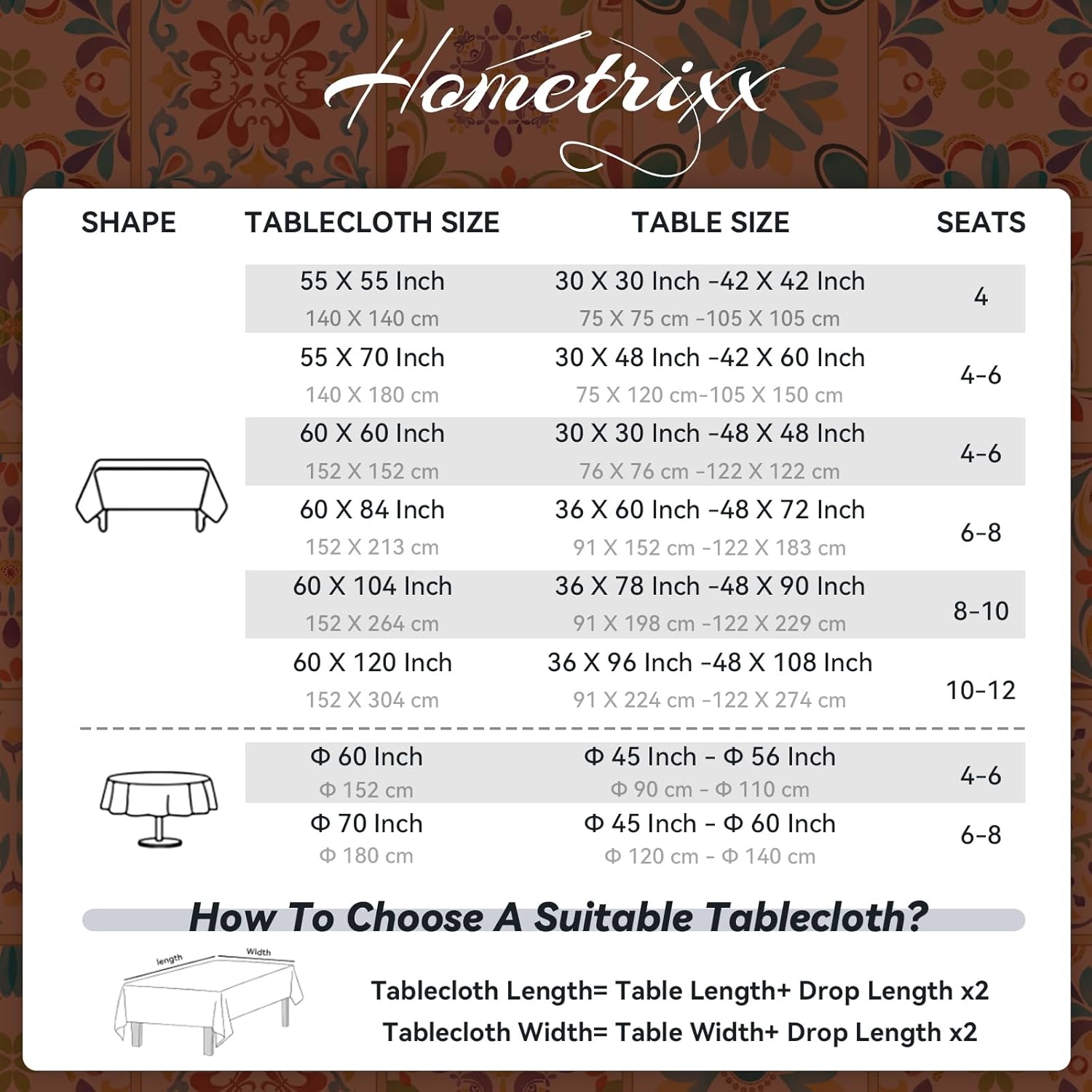 Features: Easy Care: hometrixx tablecloths are made from durable, wrinkle-resistant polyester, effectively protects your table from scratches and stains. It's machine washable for the ultimate convenience. It emerges from the wash ready to use, retains its vibrant color, and its uniquely soft, brushed feel lasts a lifetime, making it the perfect, low-maintenance choice for busy homes. Various Sizes Available: including rectangle, square, and round, we offer the ideal dimensions to drape your table beautifully, ensuring a perfect fit for daily use, parties, and more. Versatile Use: Perfect for daily dining, festive parties, outdoor picnics, or as a decorative throw. It’s the all-in-one solution for a stylish and protected table. Note: Please measure your tabletop dimensions of length, width before purchasing the tablecloth; Please allow 1-2 cm error due to manual measurement. Due to the difference in light, there will be slight color differences. Due to being folded for a long time in the package, wrinkles may occur. So after receiving our tablecloths, you can eliminate the wrinkles by machine washing it in cold water or ironing it at low temperature. Package Including: 1 x Tablecloth (60"x120"/152x304cm)