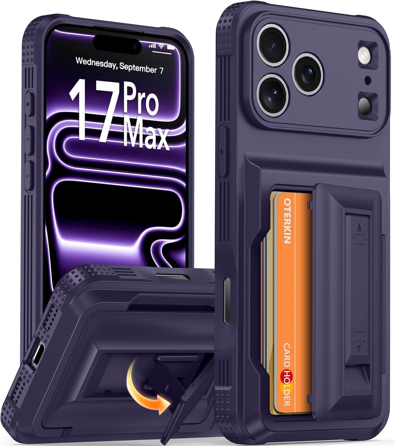 [Compatible with iPhone 17 Pro 6.3-inch Only] Designed specifically for iPhone 17-Pro-6.3 inch, the Oterkin wallet case features upgraded full-coverage camera protection with 3.0mm raised borders around the lens, providing complete safeguarding while maintaining instant shooting capability. [RFID/NFC Blocking Technology] The Oterkin iPhone 17 Pro wallet case features RFID/NFC blocking technology that securely protects against 13.56--MHz signal scanning, safeguarding your credit cards, driver's license, and IDs from electronic theft. Ideal for secure shopping, travel, and everyday use. [Spacious Card Storage] This iPhone 17Pro wallet case conveniently stores 4-5 cards plus cash in its built-in slots, offering quick access while eliminating bulky wallets from your daily carry. Note: The card holder has an all-in-one design and doesn't support wireless charging. [Reliable Built-in Kickstand] The Oterkin iPhone 17 Pro case has an embedded stand with a smooth touch, providing stable support for hands-free viewing and mobile photography. The stand has undergone over 30,000 opening and closing tests, proving its durability while supporting your phone in both portrait and landscape modes. [Military-Grade 15FT Drop Protection] The Oterkin iPhone 17 Pro wallet case features corner airbags and 2 mm raised edges that meet MIL-STD-810G standards, with soft silicone grips for secure handling and slip prevention.