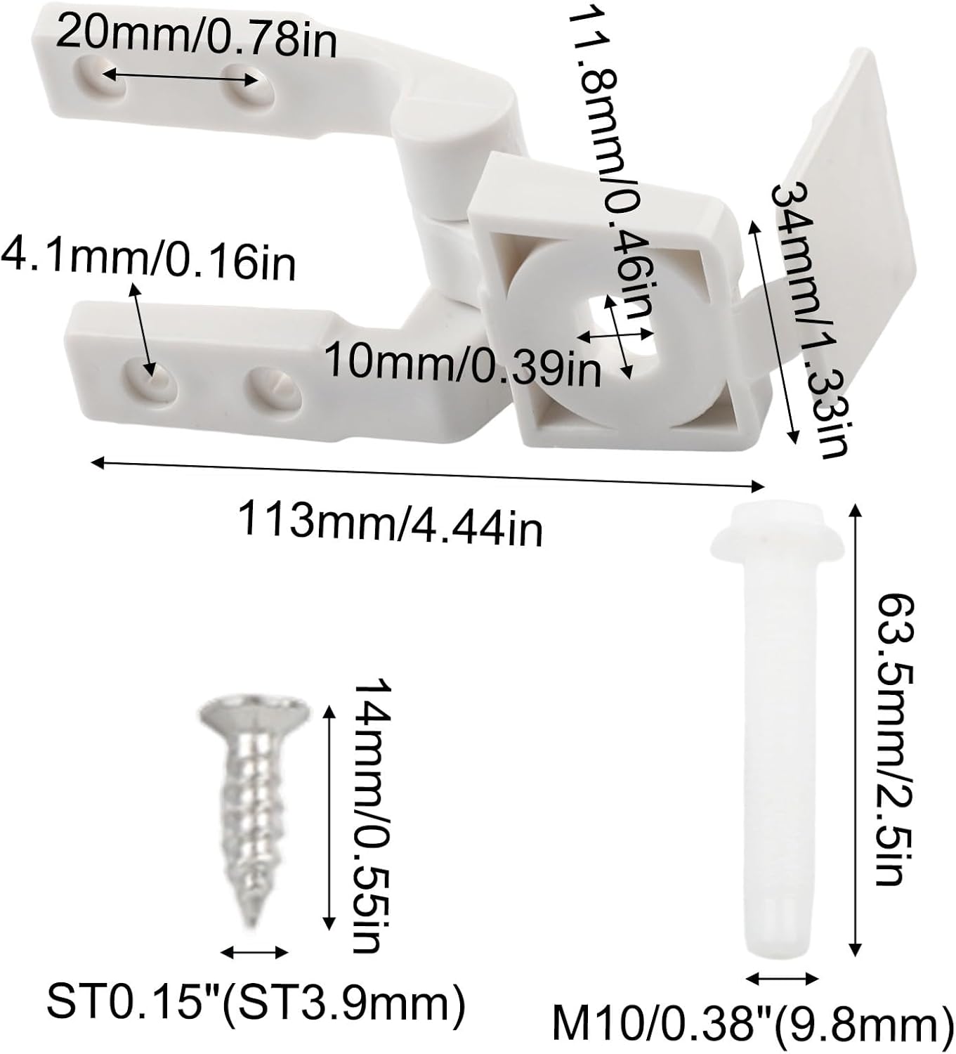Features:*Widely Applicable: These toilet lid hinges are designed to fit a majority of front toilet seats, offering a convenient and cost-effective solution for replacement without needing to buy a whole new seat.*Strength and Durability: Constructed from solid plastic, these hinges boast a sturdy white finish that provides both strength and longevity, make sure they withstand daily use.*Easy to Install: The kit includes all necessary components, making the installation process straightforward; with basic tools, you can replace your toilet seat hinges in no time.*Important Installation Tip: To make sure the longevity of the hinges, it's crucial to avoid overtightening during installation, as excessive pressure can to breakage.*Complete Kit: The package contains one pair of toilet seat hinges, one pair of bolts, and eight screws, providing everything needed for a hassle-free installation.Specifications:*Product Name:Toilet Hinge Bolt Set*Material:plastic*Size:As shown*Color:whitePackage Content:1 pair of toilet seat hinges1 pair of bolts8 screwsNote:1. The real color of the item may be slightly different from the pictures shown on website caused by many factors such as brightness of yourand light brightness.2. Please allow slight manual measurement deviation for the data.