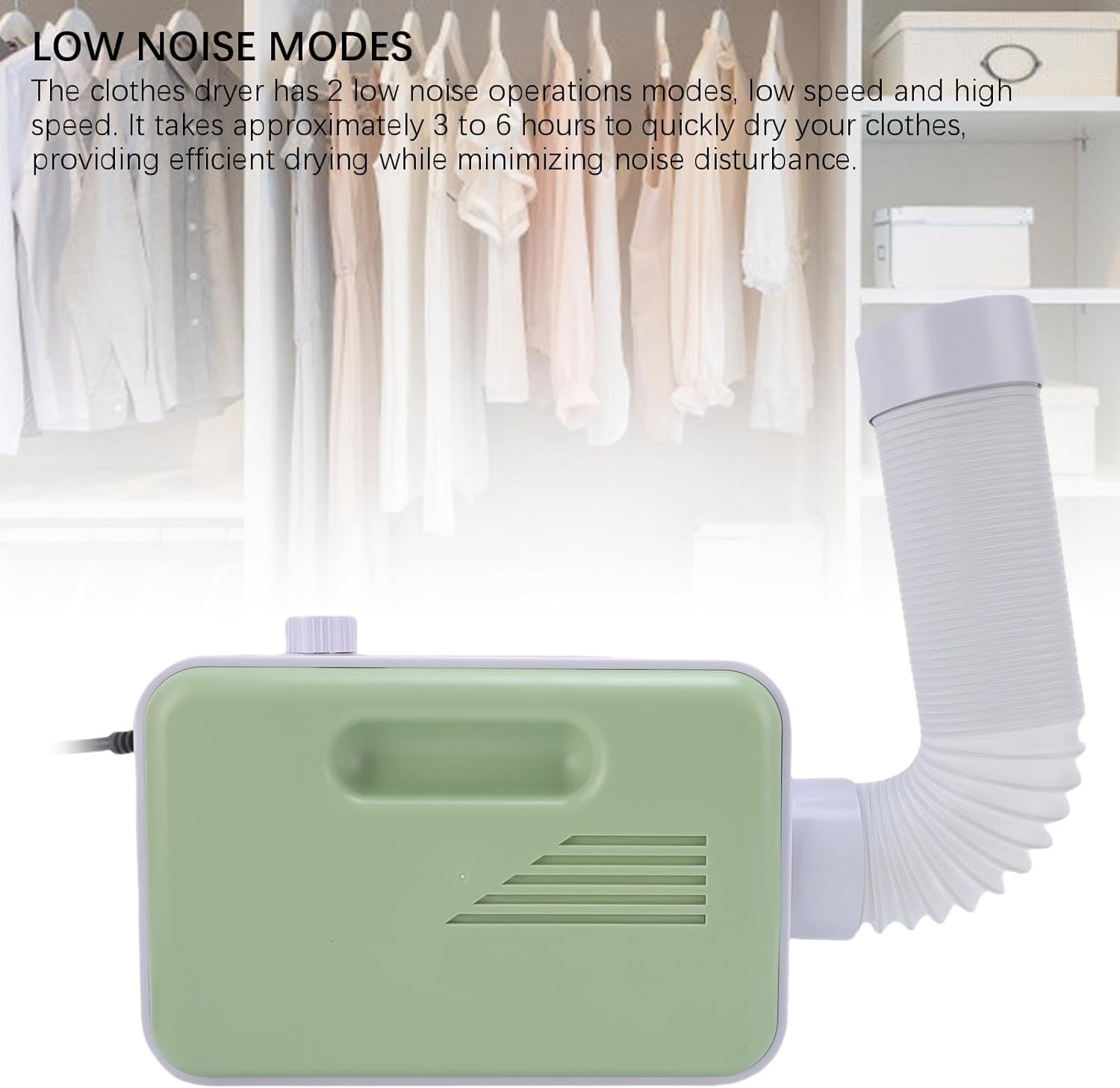 1. PORTABLE AND CONVENIENT: The compact and lightweight travel clothes dryer is excellent for various locations such as travel, apartments, hotels, and dorms. Its portability and small footprint make it easy to carry and use in different environments without any inconvenience. 2. FOLDABLE DESIGN: The multifunctional clothes dryer features a portable foldable design, making it easy to hang and store in any available space. This clever design not only saves valuable space but also provides flexibility in storage and usage, making it a practical choice for those with limited storage space. 3. QUICK DRYING: The portable clothes dryer can quickly dry your clothes, allowing you to enjoy healthier and cleaner clothes immediately with its efficient drying mode. This ensures that you have dry clothes ready in no time, enhancing your convenience and comfort. 4. LOW NOISE MODES: The clothes dryer has 2 low noise operations modes, low speed and high speed. It takes approximately 3 to 6 hours to quickly dry your clothes, providing efficient drying while minimizing noise disturbance. 5. VERSATILE USE: The electric dryer is suitable for various garments including underwear, swimsuits, pet clothing, socks, and undershirts. Its multifunctional use makes it a valuable tool for drying a variety of garments to meet different drying needs. Spec: Item Type: Portable Clothes Dryer Material: ABS Weight: Approx. 1020.00g / 35.98oz How to Use: Plug in the plug to use Package List: 1 x Clothes Dryer 1 x Hose