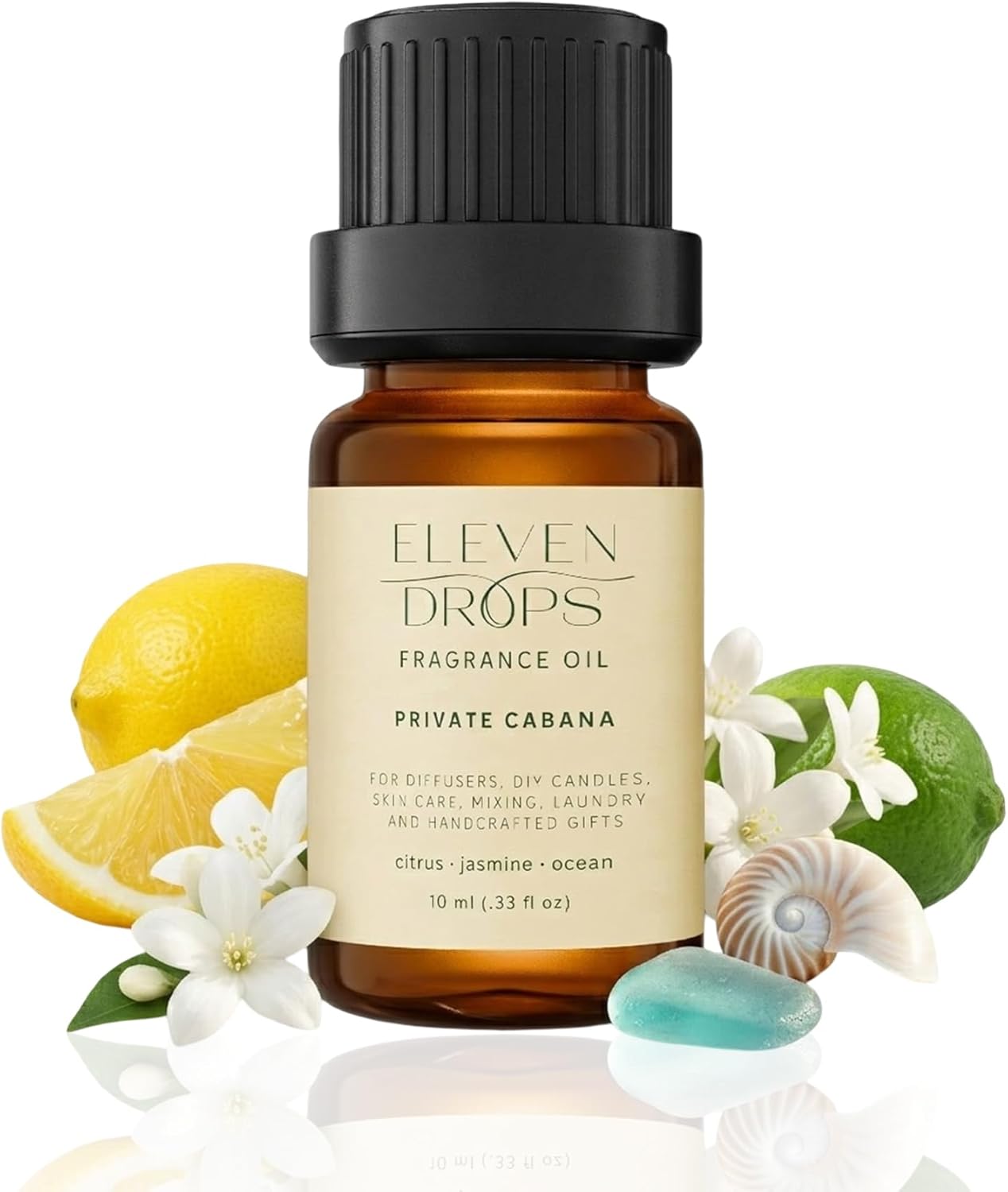 ELEVEN DROPS CABANA FRAGRANCE OIL CITRUS JASMINE OCEAN BLEND FOR WATERLESS DIFFUSERS & MOREEnhance your space with Eleven Drops home fragrance oil, a premium citrus, jasmine, and ocean notes crafted for waterless diffusers and linen sprays. The pet-safe formula of the cabana diffuser oil allows you to create a pleasant, welcoming atmosphere in homes, offices, hotels, and cars. The secure cap and controlled dropper make it easy to measure small amounts for precise application, so you enjoy the perfect scent every time.This long-lasting aroma fragrance oil delivers a consistent, fresh aroma, ideal for anyone who appreciates a high-quality scent that is safe for people and pets. Packaged in an amber glass bottle, it is travel-friendly and convenient for daily use.KEY FEATURES:Pet Friendly Formula: Safe for use around pets while maintaining a fresh, inviting scent.Premium Cabana Scent: This cabana fragrance oil has premium citrus, jasmine, and ocean notes suitable for waterless diffusers and linen sprays.Easy to Use: The secure cap on the diffuser fragrance oil allows easy, mess-free use with a controlled pour every time.Long-Lasting Fragrance: Keeps your home, office, or car smelling fresh for hours.Compact Size Bottle: The compact size of the cold air diffuser oil is perfect for use at home or in the car.Bring a long-lasting, luxurious fragrance to your space with Eleven Drops diffuser oils scents for home, creating a comfortable, inviting environment for family, guests, and pets. Its versatile, high-quality scent is perfect for everyday use or special occasions