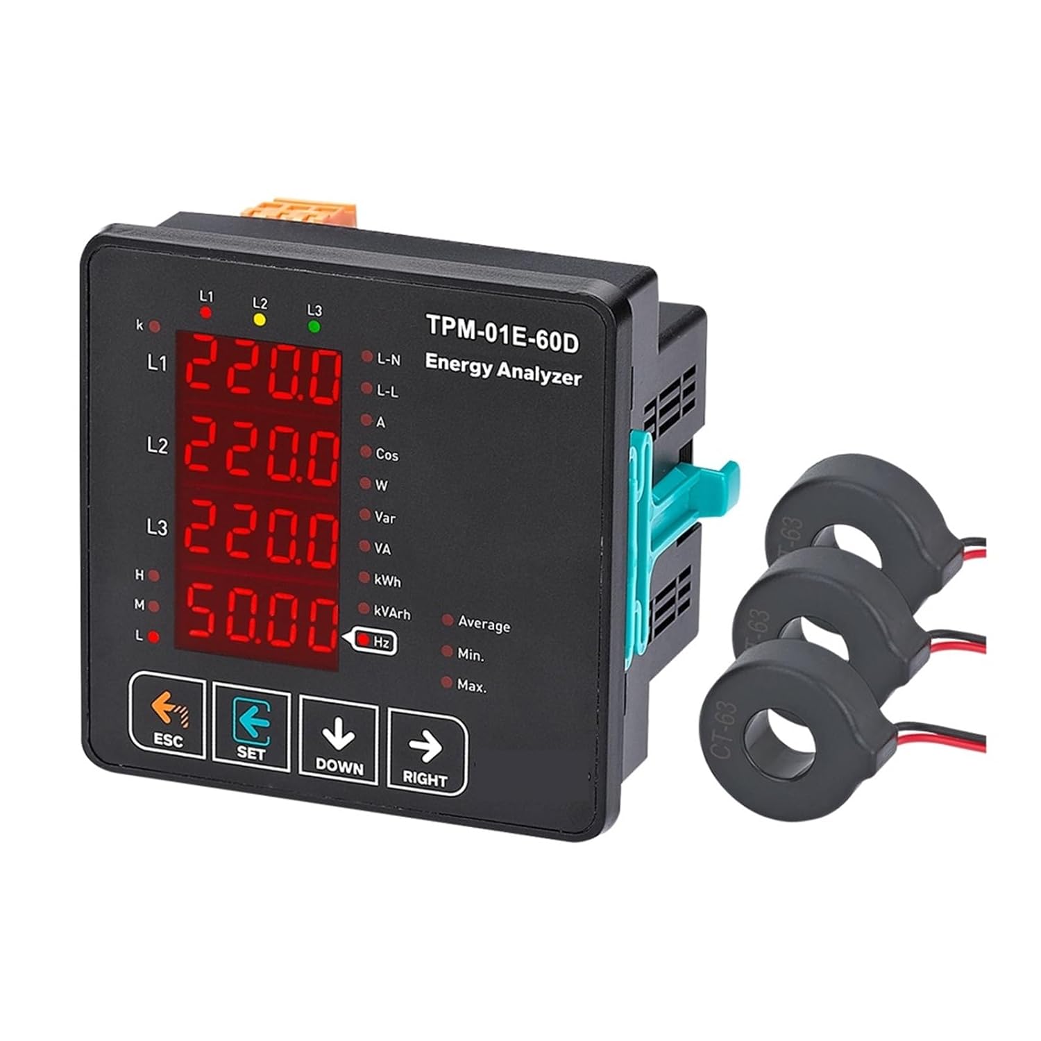 SpecificationsOperating Voltage(Un).......: 85V - 240V ACOperating Frequency..........: 50/60 Hz.<;10VAOperating Temperature.....: -20°C.....+55°CVoltage Input......................: 5V ~ 330V ACVoltage Range..........: 5V ~ 330kVCurrent Input........................: 10mA ~ 5.5ACurrent Range...........: 10mA ~ 5.500AVoltage, Current Accuracy...:%±0.5Active Accuracy....................:%±1Reactive Accuracy................:%±2Supported Connection.........:3P4WCurrent Transformer Ratio....:1....1000Voltage Transformer Ratio....:1,0....999,9Display....:4x4 Digit 14mm LED Display 20xLEDs<;300gr.Protection Class..:IP41(Font Panel), IP20(Body)Panel Hole Sizes....................:91mm x 91mmConnection Type.................: Plug-in terminalCable Diameter....................: 1,5mm²Mounting............: Mounting on panel front coverOperating Altitude.............: