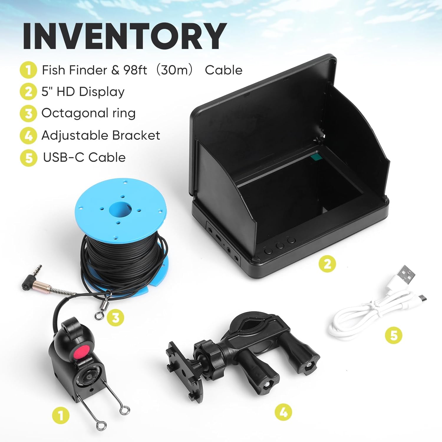 | Included Components | 5" HD Display, Adjustable Bracket, Fish Finder & 98ft(30m)Cable, Octagonal ring, USB-C Cable |