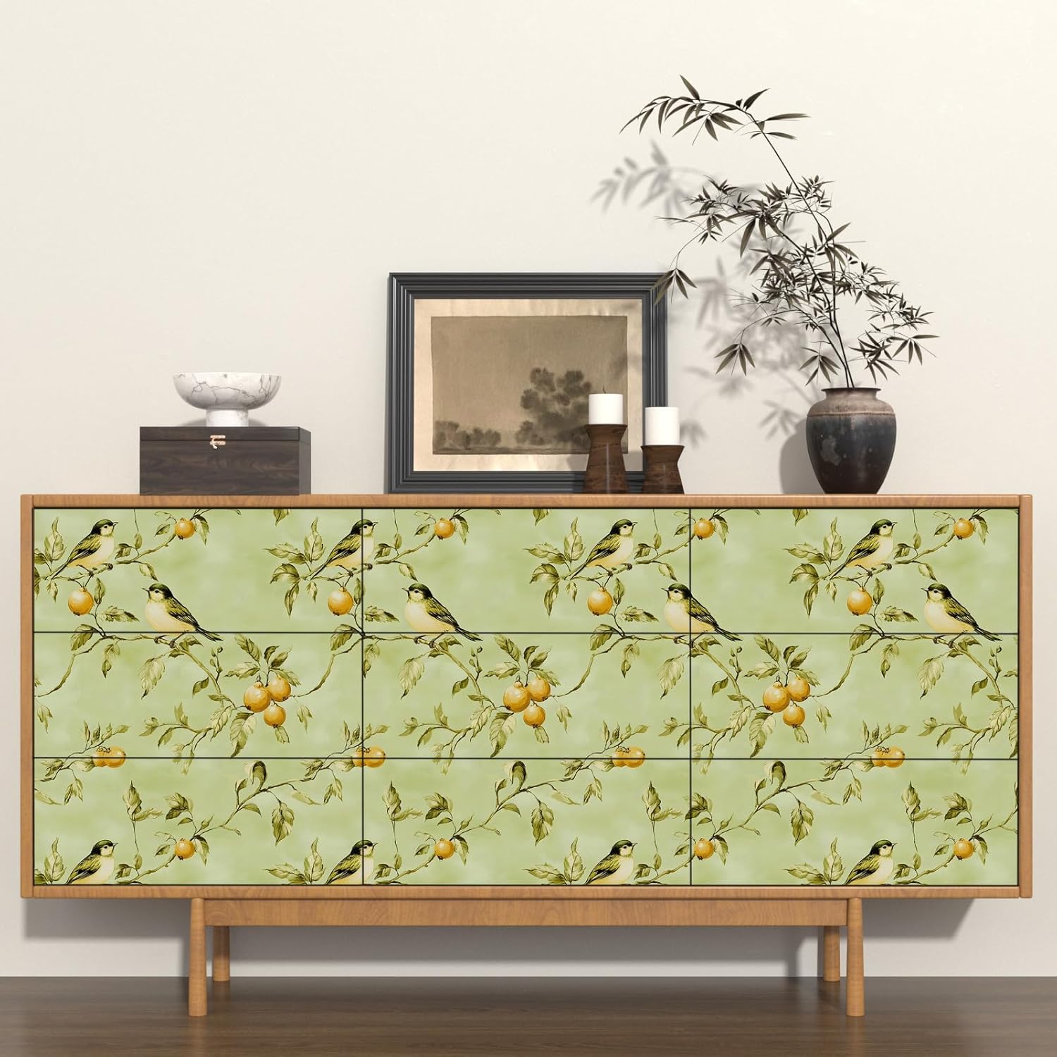 Birds Wallpaper Peel and Stick,Vintage Light Green Contact Paper with Birds and Orange Fruits PatternProduct Specifications:Lattse strives to create a wallpaper that truly embodies the beauty and vitality of nature, which matches most home designs and gives your furniture a new look.1.Size: 17.5Inches x 393 inches /roll, 1 x Birds Contact Paper/package2.Color: Light Green, Orange 3.Material: Thick vinylProduct Description Birds wallpaper, green peel and stick wallpaper,floral peel and stick wallpaper, vintage wallpaper peel and stick,green bird wallpaper, botanical wallpaper, birds wallpaper peel and stick, vintage wallpaper stick and peel, fruits peel and stick wallpaper, botanical peel and stick wallpaper, floral patterned contact paper, high quality durable wallpaper, vintage wallpaper, oil-resistant wallpaper, removable wallpaper.Applicable places:Birds wallpaper for bedroom, light green wallpaper for cabinets, floral contact paper for room walls, floral cantact paper for cabinet, countertops, living room, bookshelf, closet shelf, floor, floral decor for walls,tenant friendly as temporary wallpaper for apartments.How to InstallStep 1: Clean up the surface, make sure the surface is clean and dry before install. NOTE: Contact paper is suitable for smooth and flat surface, please dont's use it on uneven or cracked area.Step 2: Measure the surface and cut the wallpaper. We recommended to leave a margin about 2 inch on each side.Step 3: Peel off the backing paper about 1 inch, line up the contact paper with the surface, and stick carefully.Step 4: Peel off more backing paper slowly, and stick the contact paper gently at the same time, operate from one side to other side. If wrinkles or bubbles occur, tear off the wallpaper gently and do stick again. NOTE: Please do not peel off all the backing paper at once, peel off the backing paper about 1 inch-2 inch each time, so you can correct it quickly if any mistake.Step 5: Repeat step 4 until the whole surface been covered.Tips:1. This floral peel and stick wallpaper is a good weight and thickness, much thicker than regular contact paper. 2.Two people work together can make the installation easier.3. The color of floral wallpaper may vary due to individual screen resolution and lighting.