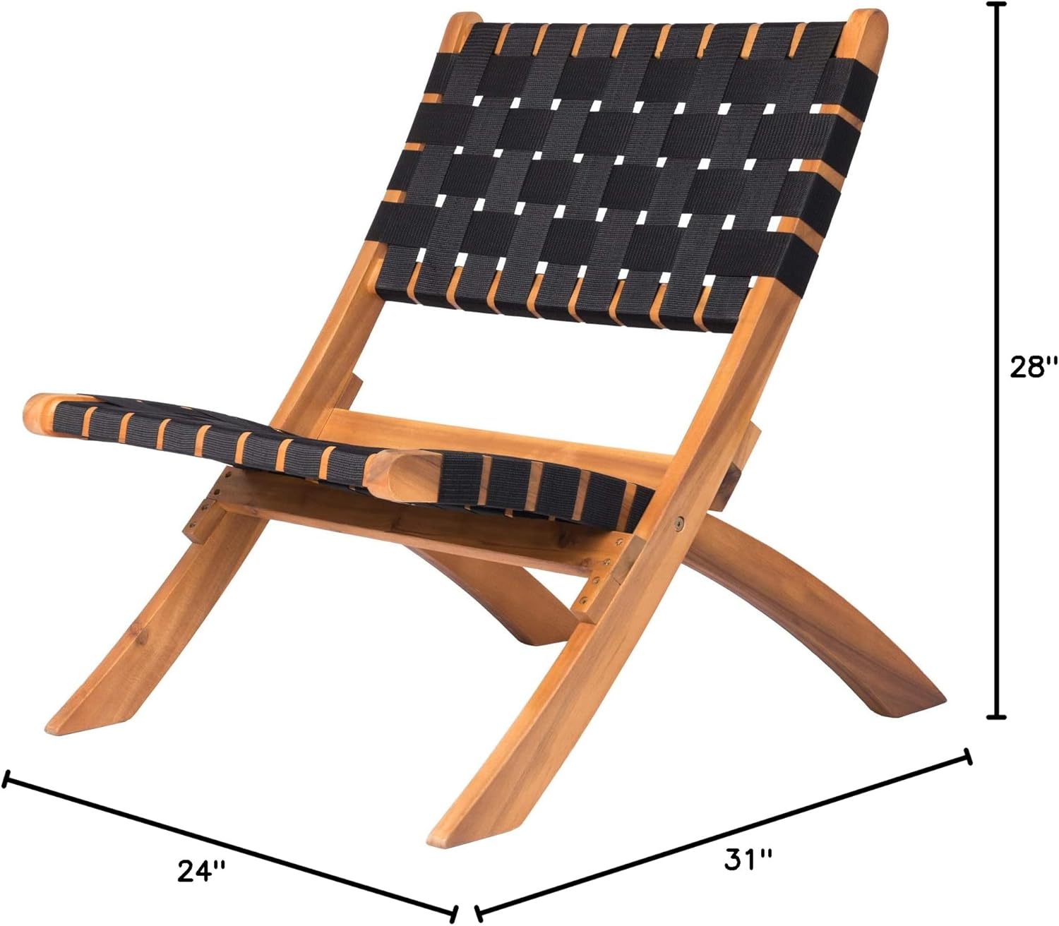 The Sava Outdoor Folding Chair is low-slung, portable seating with a solid Acacia-wood frame and woven webbing seat and back. The attractive natural finish is the perfect accent for any patio or indoor living area, and also conveniently folds for storage or transport. The comfortable design is perfect for relaxing poolside or creating casual seating arrangements. The Sava Chair can be used all season long with basic care and maintenance, and may be easily stored away in the off-season thanks to its folding design.